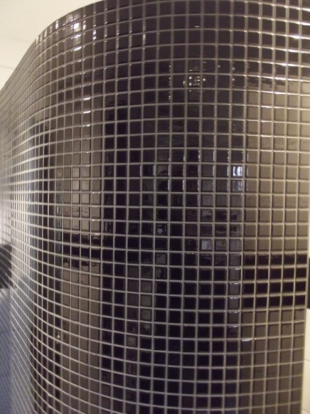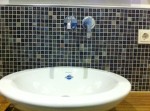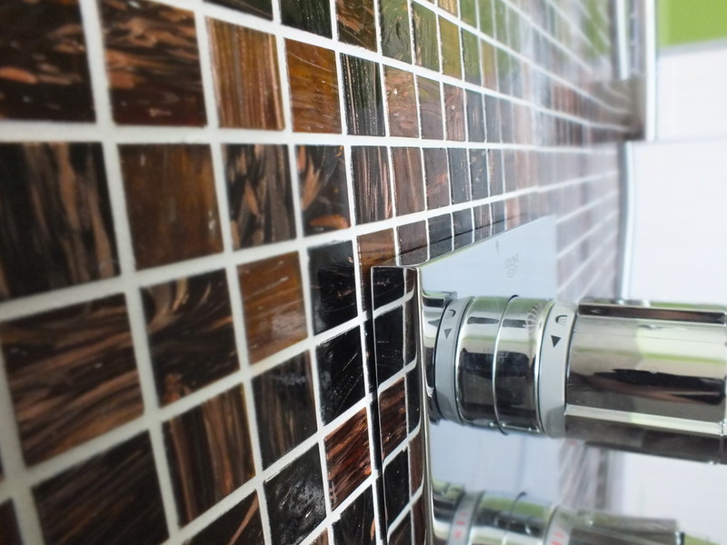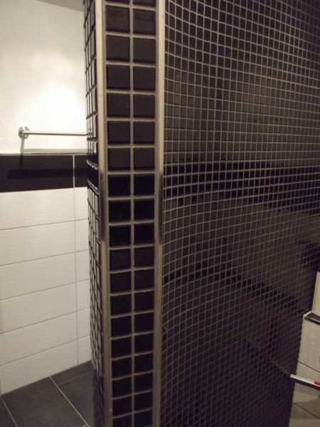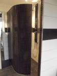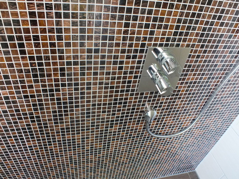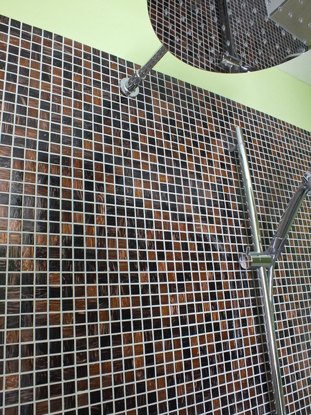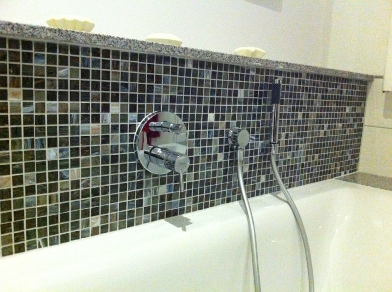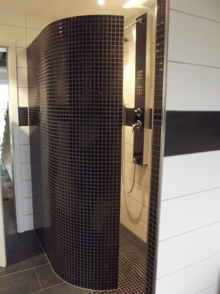 Die mit Glasmosaik besetzte Duschschnecke stellt den zentralen Blickfang dieses Badezimmers dar.